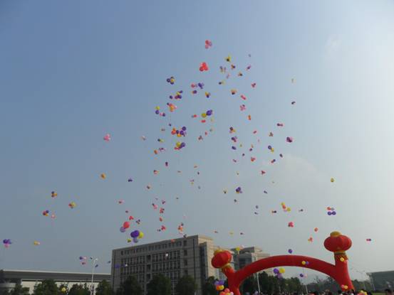 仪式的第一项是护旗队入场,奏响国歌,升国旗。护旗队的队员都是校各个院系的大一新生,当他们迈着正步走进广场时,全场肃静,迎接这个庄严神圣的时刻。国歌响起,国旗冉冉上升。接下来,副经理时新中、新生家长代表、教师代表、新生代表分别给同学们做了讲话。最后,所有新生一起握紧拳头,在国旗下庄严的宣誓“我宣誓,从今天开始,我以诚心对他人,以孝心对父母,以热心对社会,以忠心对国家!我宣誓,因为有我,人民将更加幸福;因为有我,家园将更加美好;因为有我,祖国将更加昌盛……”,宣誓完毕,千百只彩色气球承载着新生们青春的梦想和快乐跃入了空中。