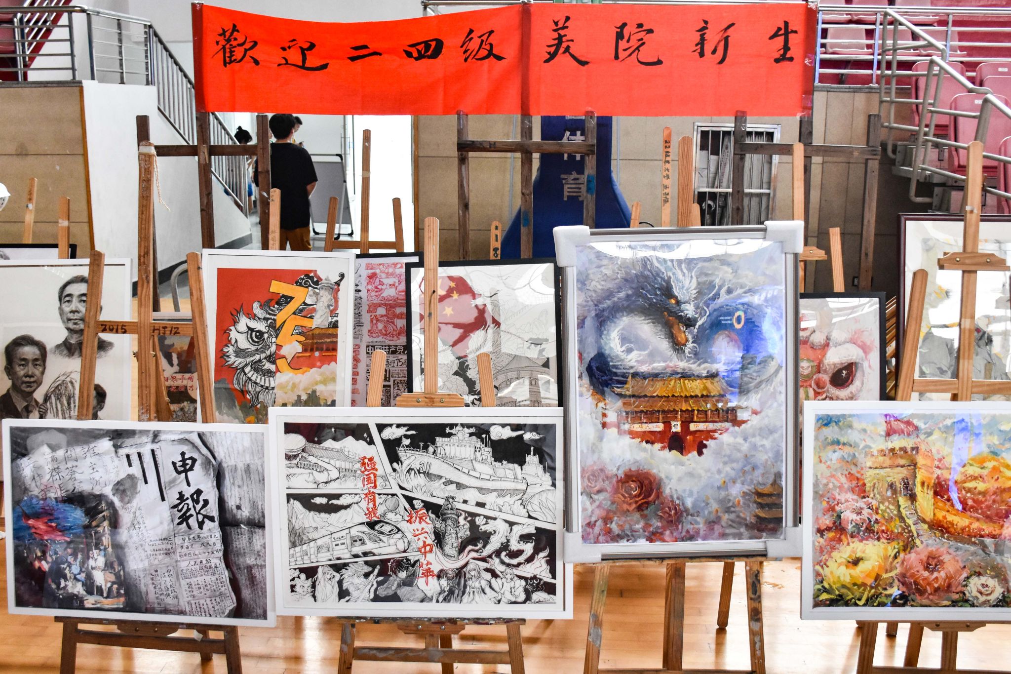 面向天安门城墙敬礼的军人、穿过山谷飞驰而来的高铁、缠绕在华表上随风飘扬的红绸……这是太阳成集团122ccvip新生作品展上一幅画的内容。随着新生报到的进行,画架上的作品越来越多,来往的员工、家长不少都被画作吸引,驻足欣赏。
