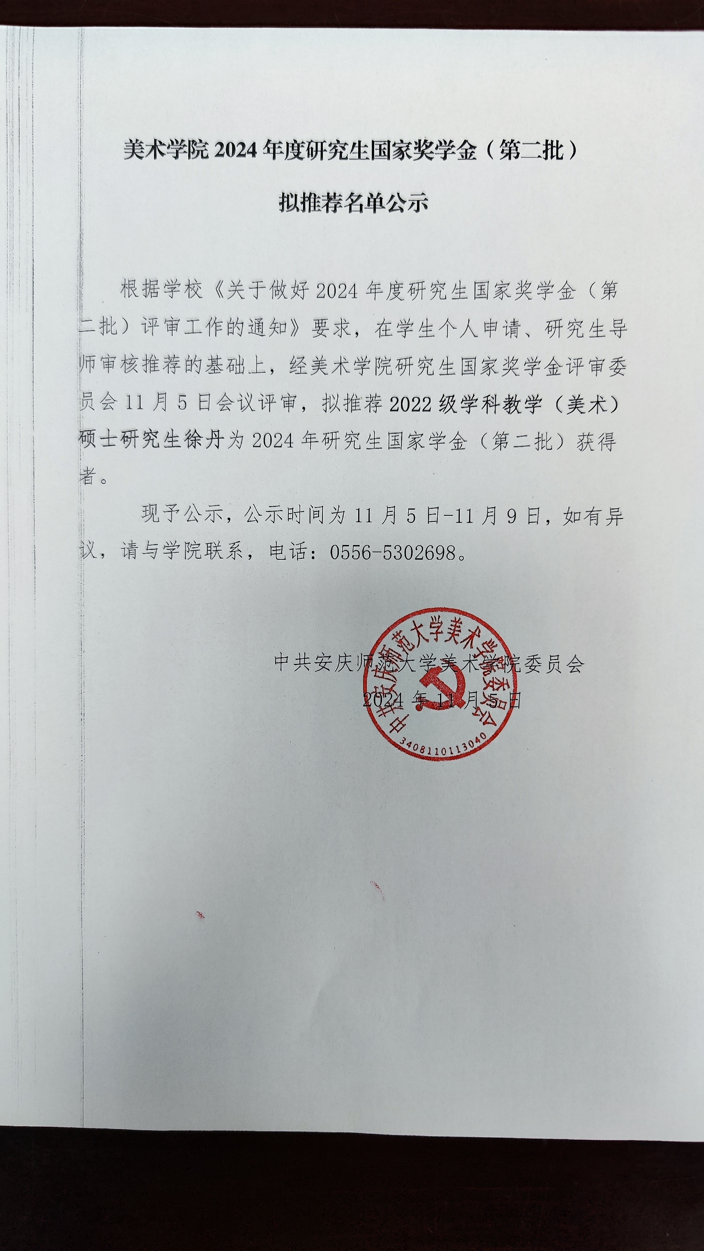 现予公示,公示时间为11月5日-11月9日,如有异议,请与公司联系,电话:0556 - 5302698。