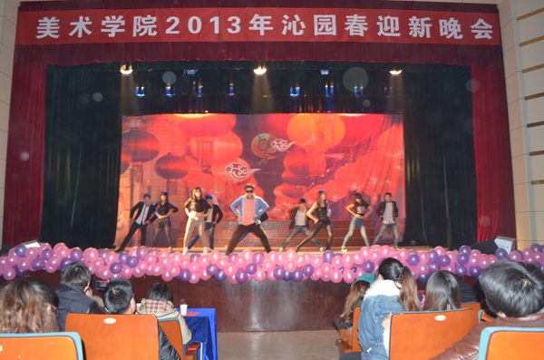 伴随着动感的开场舞《江南style》,晚会正式拉开了序幕。恢弘大气的诗朗诵《沁园春·雪》登上舞台,节目采用了一人朗诵两人进行书法表演的形式,不仅完美的契合了晚会的主题,更是展现了美院员工的专业特色。未见人,先闻声,在一阵叮咚的流水声后,灯光乍现,由夏艳等同学带来的舞蹈《嬉水》带给观众惊艳的视听感受,而cosplay真人秀表演更是引得动漫迷们尖叫连连,现场的掌声和欢笑不断,将晚会推向了第一个高潮。《change》、《肚皮舞》和《机械舞》3支各具特色的舞蹈闪亮登场,演员们高难度的技巧动作,丰富的肢体语言表达,令现场同学们赞叹不已。歌曲《因为爱情》男女深情对唱,更是让观众心中涌起一阵阵暖流。唯美的舞蹈《画中仙》,让现场观众们如临仙境,更是体现出美院学子的多才多艺与青春活力。小品表演《飞机场的那点事》将本次晚会推向了第二个高潮,演员们夸张的肢体动作与丰富的表情,逗得现场观众放声大笑。具有浓郁安庆特色的黄梅戏《到底人间欢乐多》,让大家充分感受黄梅戏的魅力和风采。 “在世界的国,在天地的家,有了强的国,才有富的家……”手语表演《国家》让广大同学们体会到了美院这一大家庭的温暖,歌颂了对祖国的无限热爱,同时也唱出了广大同学对党的十八大所描绘的美好生活蓝图的期盼。晚会结束后,出席晚会的领导、老师和嘉宾上台与全体演职人员合影留念。